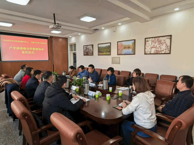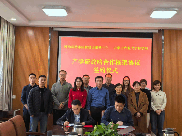 2025年11月21日,林学院与呼和浩特市园林建设服务中心在林学院三楼会议室举行产学研战略合作框架协议签约仪式。林学院院长岳永杰、林学院党委副书记韩胜利、园林系主任闫晓云、风景园林系主任赵红霞,以及呼和浩特市园林建设服务中心副主任靳慧卿及相关科室负责人出席仪式。