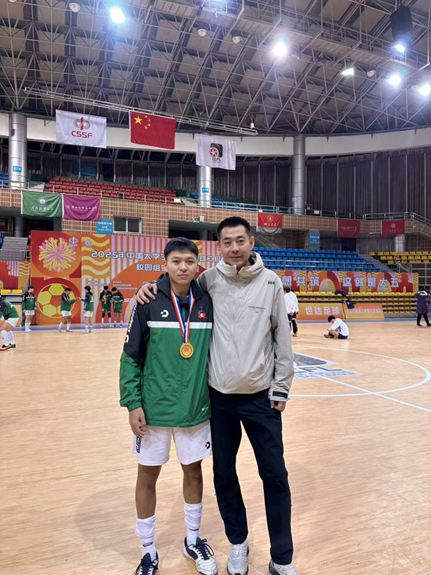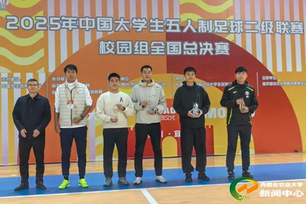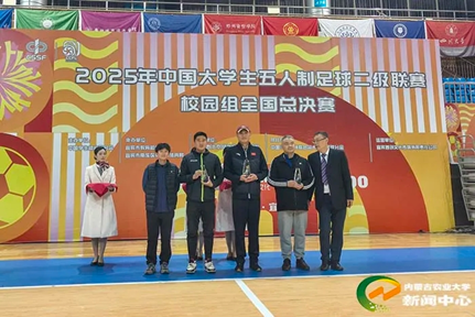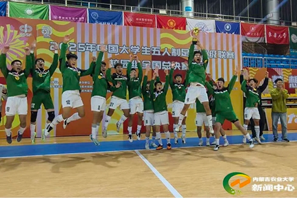 11月19日晚,2025年中国大学生五人制足球二级联赛(校园组)全国总决赛于四川宜宾圆满收官。我校足球队在巅峰对决中,以3:2的比分战胜浙江财经大学队,成功夺得赛事总冠军。林学院25园林2班白音宝力格同学作为校队一员,在赛场上奋力拼搏,为学校争得了荣誉,也为学院增添了光彩。