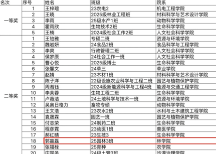 2025年11月13日至29日,林学院积极组织学子参与学校开展的消防知识网络答题竞赛。我院学子凭借扎实的消防知识储备斩获佳绩,其中2025级园林专业三班郭赢磊荣获二等奖,2025级林学专业二班陈子硕获三等奖,消防工程专业一班王丰汇、风景园林专业一班阮俊阳、林学专业四班贾沛凝获纪念奖,充分展现了林学院学子良好的消防安全意识与素养。