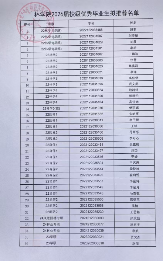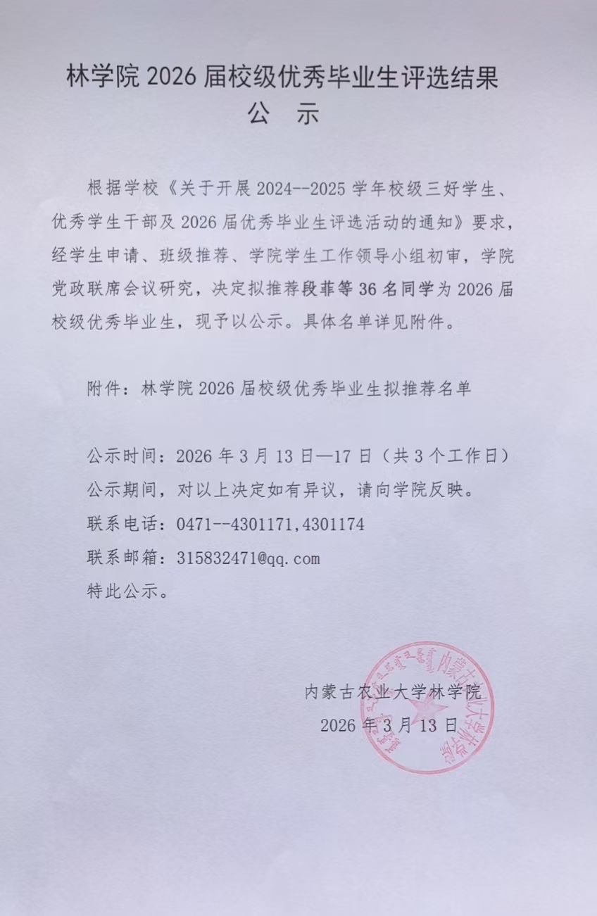 林学院2026届校级优秀毕业生评选结果公示