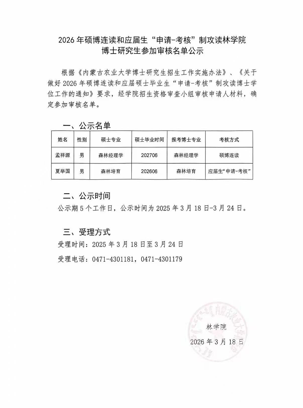 2026年硕博连读和应届生"申请-考核"制攻读林学院博士研究生参加审核名单公示